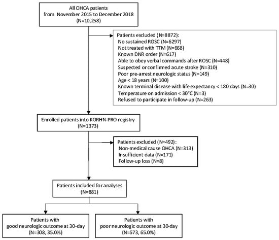 Active WLST had been legally prohibited in South Korea until February 2018, and the enrolled patients in this present study had therefore received full supportive care until death or recovery. Neurological outcomes were assessed using the CPC at hospital discharge and at one and six months after OHCA. Follow-up assessments were conducted through in-person visits or standardized telephone interviews with the patient or their primary caregiver.