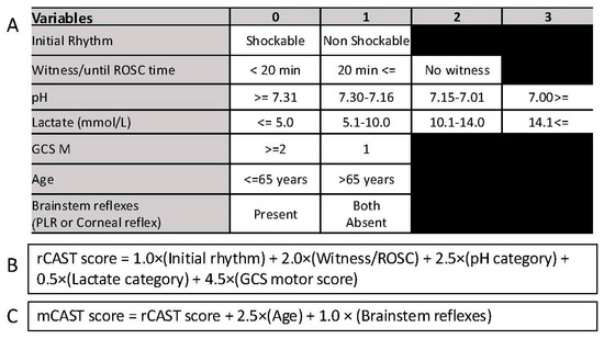 - Nishikimi, M.; Matsuda, N.; Matsui, K.; Takahashi, K.; Ejima, T.; Liu, K.; Ogura, T.; Higashi, M.; Umino, H.; Makishi, G.; et al. CAST: A new score for early prediction of neurological outcomes after cardiac arrest before therapeutic hypothermia with high accuracy. Intensive Care Med. 2016, 42, 2106–2107. [Google Scholar] [CrossRef] [PubMed][Green Version]