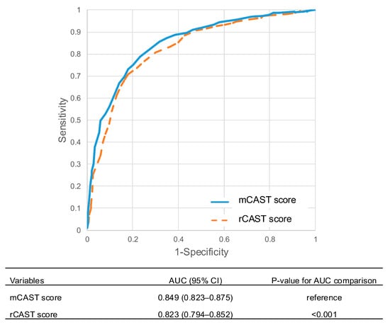 The discriminative performance of both the rCAST and mCAST scores was evaluated using receiver operating characteristic (ROC) curve analysis, and areas under the curve (AUCs) were compared using the DeLong test. In reference to a previous study that classified patients into three severity grades (low, moderate, and high) based on the rCAST score, we defined corresponding cutoff points in the mCAST score to achieve 95% sensitivity and 95% specificity [11]. All reported p-values were two-sided, and p-value of <0.05 was considered statistically significant. All statistical analyses were performed using SAS version 9.4 (SAS Institute Inc., Cary, NC, USA), IBM SPSS Statistics for Windows, version 21.0 (IBM Corp., Armonk, NY, USA), and MedCalc® Statistical Software version 20.118 (MedCalc Software Ltd., Ostend, Belgium; https://www.medcalc.org (accessed on 2 September 2024); 2022).