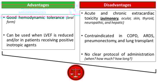 Amiodarone has demonstrated superiority over placebo in preventing POAF after cardiac surgery for a long time [23,24,25,26], and is currently recommended in several international guidelines, especially when beta-blockers are contraindicated [27,28]. The latest 2024 ESC guidelines for the management of atrial fibrillation recommend using perioperative amiodarone where drug therapy is desired to prevent POAF after cardiac surgery (Class I recommendation, level of evidence A) [29]. This is, however, at the cost of potential adverse hemodynamic effects, such as high-grade atrioventricular blocks, refractory hypotension, or cardiogenic shock. In addition, various schemes of administration have been reported, so it is currently impossible to provide a clear and consensual protocol that could be used on a routine basis. When to start amiodarone preoperatively, at which dose, and for how long are unresolved practical questions. Moreover, amiodarone and its metabolites accumulate in tissues in high concentrations and are responsible for both serious adverse non-hemodynamic effects (pulmonary, ophthalmic, hepatic, thyroid, skin, and neuropathic), and numerous drug interactions. In a retrospective study including 137 consecutive patients who underwent lung or heart–lung transplant, the prevalence of POAF within 26 days after surgery was high (45%) and the use of amiodarone was an independent predictor of short-term mortality in multivariate analysis (HR 2.97 [95% CI: 1.19–7.41], p = 0.02) [30]. Even though the lungs account for less than 5% of all amiodarone-related complications, pulmonary involvement has the most clinically meaningful impact and can contribute to patients’ mortality [31]. Thus, the individual benefit/risk ratio analysis of amiodarone therapy to prevent POAF pleads most often against its preoperative systematic use, the risks outweighing the benefits (Figure 1) [22]. The joint recommendations for best practice around prevention and management of POAF in patients undergoing cardiac surgery from both Society of Cardiovascular Anesthesiologists and European Association of Cardiothoracic Anaesthetists suggest using prophylactic amiodarone only in patients deemed at high risk of developing POAF (Class IIa recommendation, level of evidence A/B) [32].