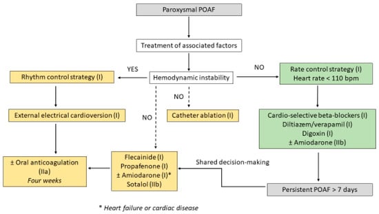 Postoperative atrial fibrillation (POAF) is defined as new-onset atrial fibrillation that occurs within the first postoperative days following cardiac and noncardiac surgery. POAF is a common complication that occurs in 30–50% of patients undergoing cardiac surgery [1,2,3], 5–30% of patients undergoing major noncardiac surgery, and 5–45% of critically ill patients [4]. The reported incidence of POAF has remained remarkably steady over recent decades. POAF is a serious complication that increases postoperative cardiac, cerebral, and renal morbidity, short- and long-term mortality, lengths of stay in intensive care unit (ICU) and in hospital, and healthcare costs [5,6,7,8,9]. Numerous risk factors of POAF have been well identified. They can be divided in non-modifiable risk factors related to atrial myopathy and patients’ characteristics and comorbidities (age, gender, obesity, alcohol, sleep apnea, hypertension, valvular disease, and ventricular dysfunction) [10], and in transient modifiable stress factors accompanying acute illness (sympathetic activity, hypo-/hypervolemia, hypo-/hypertension, anemia, pain, electrolyte disturbances, metabolic alterations, hypo-/hyperthermia, hypoxia, and inflammation) [11,12,13]. From a clinical point of view, POAF is a paroxysmal phenomenon whose peak frequency occurs at postoperative day 2 (interquartile range: 1–3) [14]. More than 90% of patients with POAF return to normal sinus rhythm within the first seven postoperative days [5], even if a second acute episode is observed in 20 to 40% of cases [15]. When paroxysmal POAF lasts beyond postoperative day 7, it becomes persistent POAF. Noteworthy, POAF is associated with a 4–5-fold increase in recurrent atrial fibrillation during the next five years [16,17]. POAF is most often hemodynamically well tolerated and rarely responsible for acute circulatory failure or shock state. While multiple strategies to prevent POAF with pre-treatment or acute drug treatment have been described, there is a lack of evidence from large randomized controlled trials (RCTs). Furthermore, various treatment strategies have been described and diversely recommended in numerous international guidelines over the last twenty years. The lack of consensus regarding best practices for the management of POAF has led to major variations in practice patterns [1,18,19,20,21].