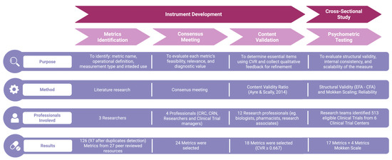 The figure illustrates the four sequential phases of the Clinical Trial Site Performance Measure (CT-SPM) development process: Metrics Identification, Consensus Meeting, Content Validation, and Psychometric Testing. For each phase, the diagram reports: the main purpose (e.g., identifying relevant metrics, evaluating content validity, assessing psychometric properties); the method used (e.g., literature review, expert panel discussions, Content Validity Ratio calculation, exploratory and confirmatory factor analysis); the types and number of professionals involved, and; the results obtained (e.g., number of metrics retained or refined). Abbreviations: CT-SPM = Clinical Trial Site Performance Measure; CRC = Clinical Research Coordinator; CRN = Clinical Research Nurse; CVR = Content Validity Ratio; EFA = Exploratory Factor Analysis; CFA = Confirmatory Factor Analysis [31].