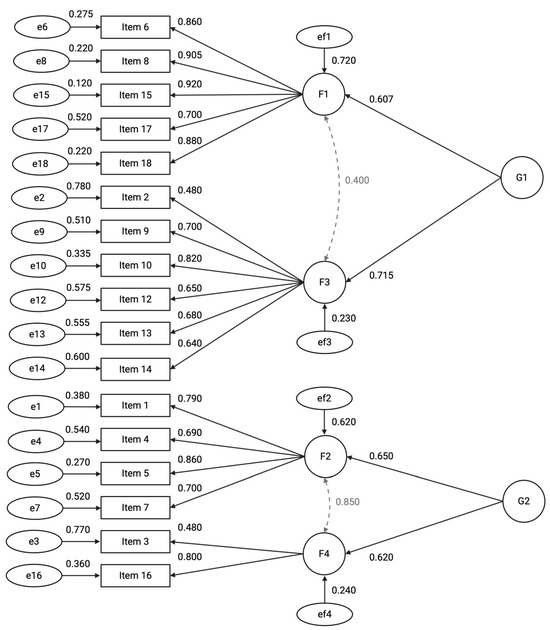 Path diagram of the hierarchical factor model illustrating relationships between latent constructs and observed variables. First-order factors (F1–F4) are indicated by circles, each measured by multiple observed items (rectangles) with standardized factor loadings shown on single-headed arrows. Second-order factors (G1 and G2) influence the first-order factors, with standardized regression coefficients labeled on the paths. Residual variances for observed items and first-order factors are represented by error terms (ellipses) with corresponding estimates. Bidirectional arrows denote covariances among first-order factors. All parameter estimates are fully standardized. For clarity, residual covariances between items—specified in the model—are not depicted in the diagram.