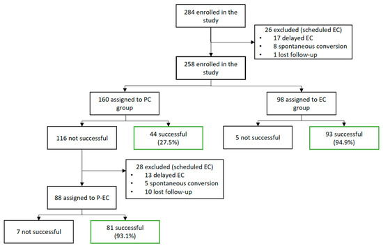 The outcome variable was the success rate of conversion to sinus rhythm in both the PC and EC groups. The need for additional procedures (consecutive EC) for rhythm control was also analyzed. Demographic and clinical characteristics were compiled in each group and compared in search of differences.