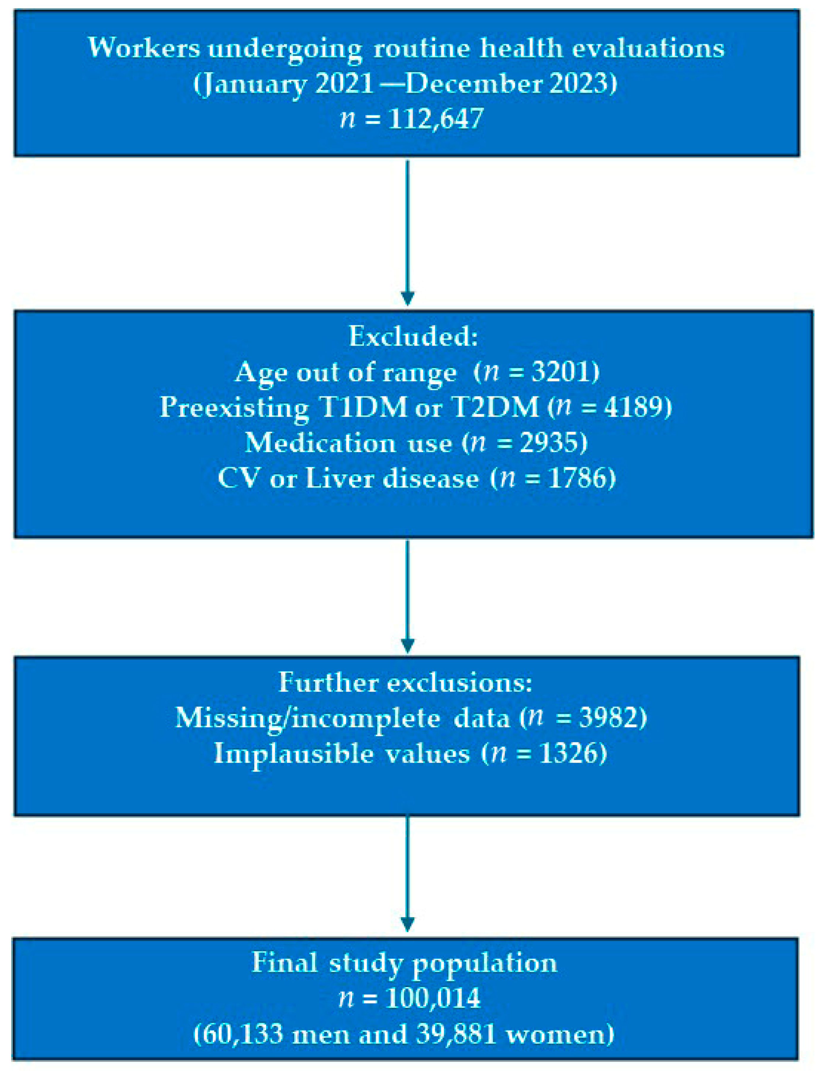 - Hu, Y.; Liang, Y.; Li, J.; Li, X.; Yu, M.; Cui, W. Correlation between atherogenic index of plasma and cardiovascular disease risk across Cardiovascular-kidney-metabolic syndrome stages 0-3: A nationwide prospective cohort study. Cardiovasc. Diabetol. 2025, 24, 40. [Google Scholar] [CrossRef] [PubMed] [PubMed Central]