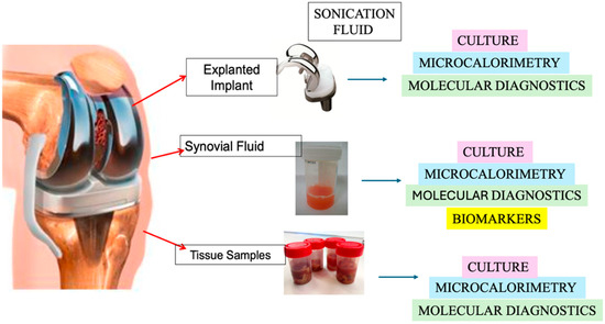 Schematic representation of the main sample types used for the diagnosis of PJI. Explanted implants are processed through sonication to obtain sonication fluid, which can be analyzed by culture, microcalorimetry, and molecular methods. Synovial fluid allows for culture, microcalorimetry, molecular diagnostics, and biomarker testing. Periprosthetic tissue samples are investigated by culture, microcalorimetry, and molecular assays.