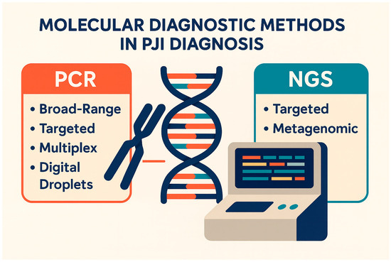 Molecular techniques such as quantitative polymerase chain reaction (qPCR) and multiplex PCR assays allow the detection of bacterial DNA directly from synovial fluid or periprosthetic tissue, improving sensitivity in culture-negative cases. More advanced next-generation sequencing (NGS) platforms can provide broad-range pathogen identification and even resistance gene profiling, offering a comprehensive view of the microbial landscape in PJI [21,22]. Despite their promise, these methods face challenges including cost, turnaround time, and difficulties in distinguishing contamination from true infection.