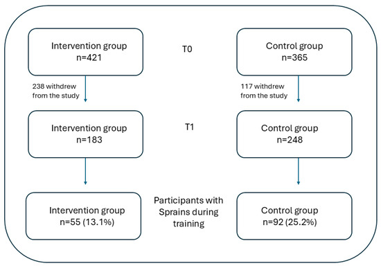 Flow chart of the number of participants in the two study groups at T0 (first assessment) and T1 (second assessment), and the number and percentage of participants with sprains acquired during training. Note: the percentage is calculated out of the total number pf participants in the respective group at T0.