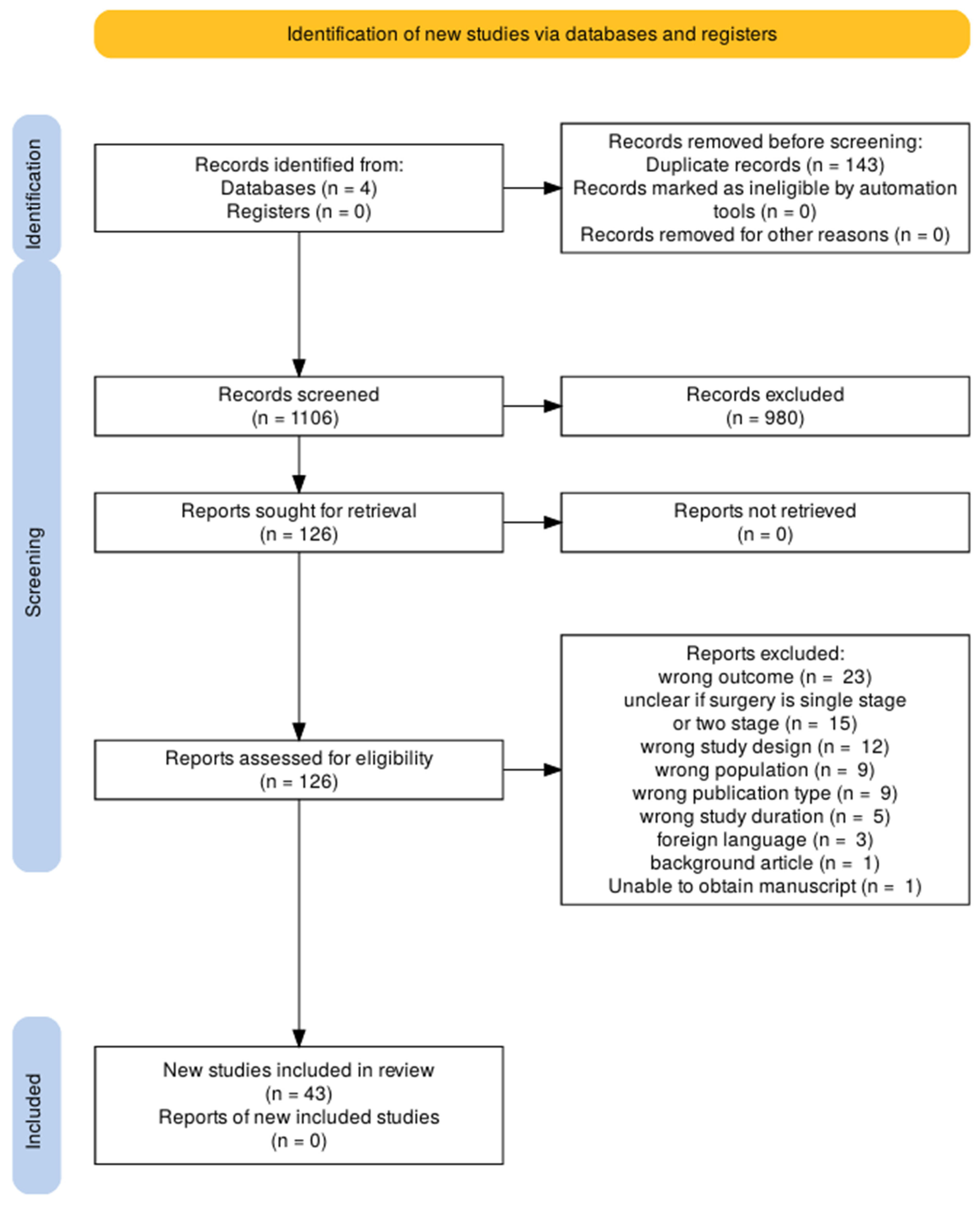 Jaibaji, M.; Najim, O.; Alali, H.; Wood, L.; Van Niekerk, L.; Bonner, T.; Volpin, A. Single-Stage vs. Multi-Stage Reconstruction in Multi-Ligament Knee Injuries: A Systematic Review and Meta-Analysis of Outcomes and Complications. J. Clin. Med. 2025, 14, 6897. https://doi.org/10.3390/jcm14196897
