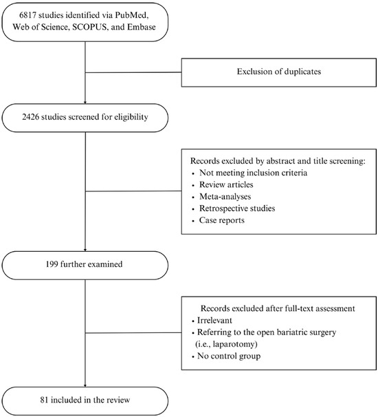 Two authors independently searched the MEDLINE (PubMed), Scopus, Embase, and Web of Science databases utilizing the keywords “bariatric surgery,” “metabolic surgery,” “laparoscopic sleeve gastrectomy,” “laparoscopic gastric bypass,” and “postoperative nausea” or “postoperative vomiting.” Furthermore, a manual review of the reference lists of the included publications was conducted to identify additional studies for possible inclusion.