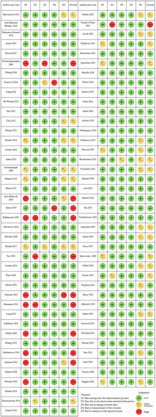 Using the Risk of Bias (ROB2) tool and the Cochrane Intervention Systematic Evaluation Manual (Cochrane Handbook for Systematic Reviews of Interventions), we conducted a methodological quality assessment of the articles that met the inclusion criteria [18]. The qualitative methodological evaluation is illustrated in Figure 2.