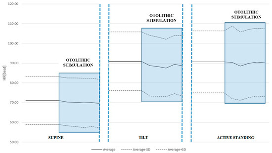 We found that during passive tilt, the average HR value throughout ACSS of the vestibule was significantly lower than the average HR values immediately before the ACSS (88.63 ± 14.68 vs. 90.96 ± 14.93, p = 0.001). There was no statistically significant difference for the supine position and active standing. The results are shown in Table 3 and are graphically presented in Figure 1.