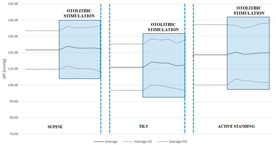 Furthermore, there was no statistically significant difference in HR, sBP, or dBP values between conditions with and without otolithic stimulation for the supine position, tilt table test, and active standing. Results are shown in Table 6, Table 7 and Table 8.