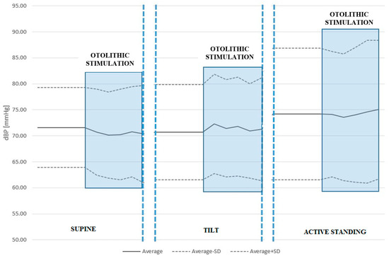 Comparison of dBP values of healthy subjects between condition with and without otolithic stimulation during supine position, tilt table test and active standing.