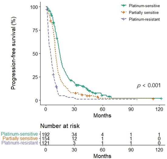 The following supporting information can be downloaded at: https://www.mdpi.com/article/10.3390/jcm14196905/s1, Table S1. Univariable Cox regression analyses of progression-free survival showing non-significant results within each platinum sensitivity group (In sensitive/partially sensitive groups, patients receiving regimens administered to ≥10% of the group were included); Table S2. Univariable and multivariable Cox regression analyses of progression-free survival for platinum-sensitive patients who received taxane plus platinum or pegylated liposomal doxorubicin (PLD) plus carboplatin as second-line chemotherapy.