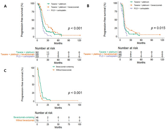 Finally, broad comparisons require careful consideration of each regimen’s specific characteristics for accurate and nuanced interpretation. The heterogeneity among cancer patients in this study should also be taken into account, regardless of the statistical tests performed. This approach, which accounts for baseline characteristics, may help identify patient populations more likely to benefit from specific chemotherapy regimens, aligning with the goals of the current precision medicine era. To better reflect real-world scenarios, we limited further analysis to regimens that were either commonly used or yielded results contrary to those reported in previous studies. For platinum-resistant patients, classification was based on bevacizumab use, given the diversity of regimens and the lack of proven superiority among them. However, among the less commonly used therapies, some showed favorable outcomes, highlighting the need for further research to identify appropriate target populations for these treatments.