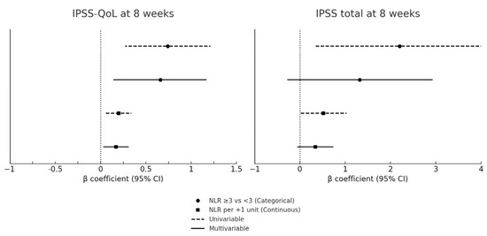 At 8 weeks, following completion of the induction course, the patients with baseline NLR ≥ 3 reported significantly worse urinary outcomes compared with those with NLR < 3. The median IPSS total score increased to 24 (IQR: 21–27) in the NLR ≥ 3 group vs. 21 (IQR: 18–23) in the NLR < 3 group (p = 0.02), corresponding to a median change of +5 points (IQR: 3–7) vs. +2 points (IQR: 1–3; p = 0.01). Urinary symptom–related QoL also deteriorated more markedly in the NLR ≥ 3 group, with an 8-week median IPSS-QoL of 5 (IQR: 4–6) compared with 4 (IQR: 3–5) in the NLR < 3 group (p = 0.03). The absolute change in QoL score was significantly greater in patients with NLR ≥ 3 (+1 [IQR: 1–2] vs. +1 [IQR: 0–1]; p = 0.04). IPSS outcomes at baseline and 8 weeks according to NLR group are reported in Table 2. Baseline NLR remained independently associated with higher IPSS-QoL scores at 8 weeks. A univariable regression confirmed that patients with baseline NLR ≥ 3 had significantly worse urinary outcomes at 8 weeks, with higher IPSS-QoL scores (β = +0.74, 95% CI: 0.27–1.21; p = 0.003) and higher IPSS total scores (β = +2.20, 95% CI: 0.35–4.05; p = 0.021) (Table 3). When NLR was analyzed as a continuous variable, each 1-unit increase was associated with a 0.20-point worsening in IPSS-QoL (95% CI: 0.05–0.34; p = 0.008) and a 0.52-point increase in IPSS total score (95% CI: 0.02–1.03; p = 0.042). In multivariable models adjusted for baseline IPSS and concomitant CIS, NLR remained an independent predictor of QoL deterioration (β = +0.66, 95% CI: 0.14–1.17; p = 0.014; per 1-unit increase: β = +0.17, 95% CI: 0.03–0.31; p = 0.019), whereas its association with IPSS total score was attenuated and no longer statistically significant. The results of the regression analyses are detailed in Table 3 and illustrated in Figure 1.