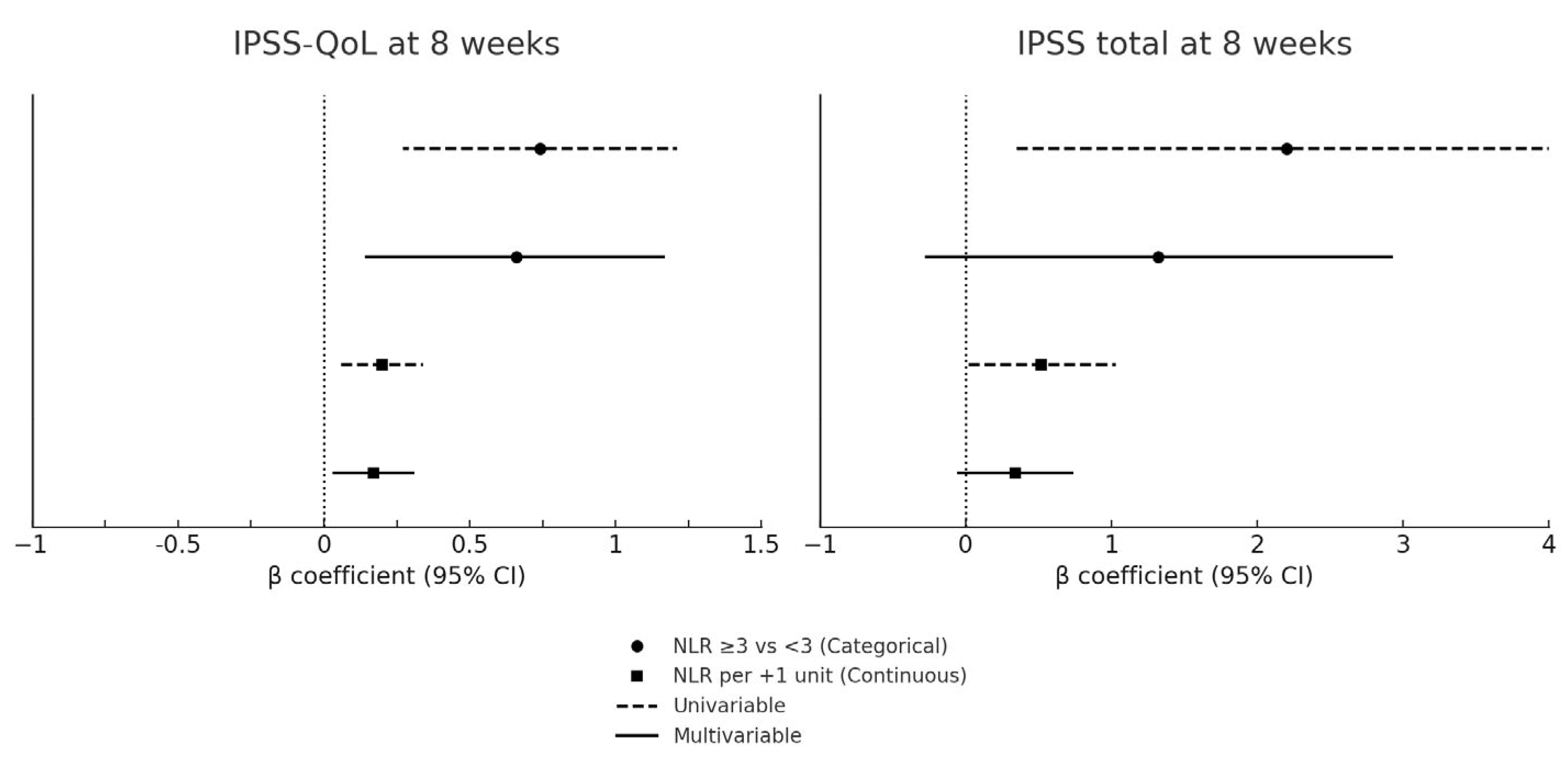 IPSS-QoL (primary) | Univariable | NLR ≥ 3 (vs. <3) | +0.74 (0.27 to 1.21) | 0.003 |