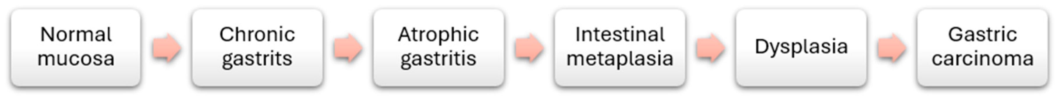 - Dinis-Ribeiro, M.; Libânio, D.; Uchima, H.; Spaander, M.C.; Bornschein, J.; Matysiak-Budnik, T.; Tziatzios, G.; Santos-Antunes, J.; Areia, M.; Chapelle, N.; et al. Management of epithelial precancerous conditions and early neoplasia of the stomach (MAPS III): European Society of Gastrointestinal Endoscopy (ESGE), European Helicobacter and Microbiota Study Group (EHMSG) and European Society of Pathology (ESP) Guideline update 2025. Endoscopy 2025, 57, 504–554. [Google Scholar] [CrossRef]