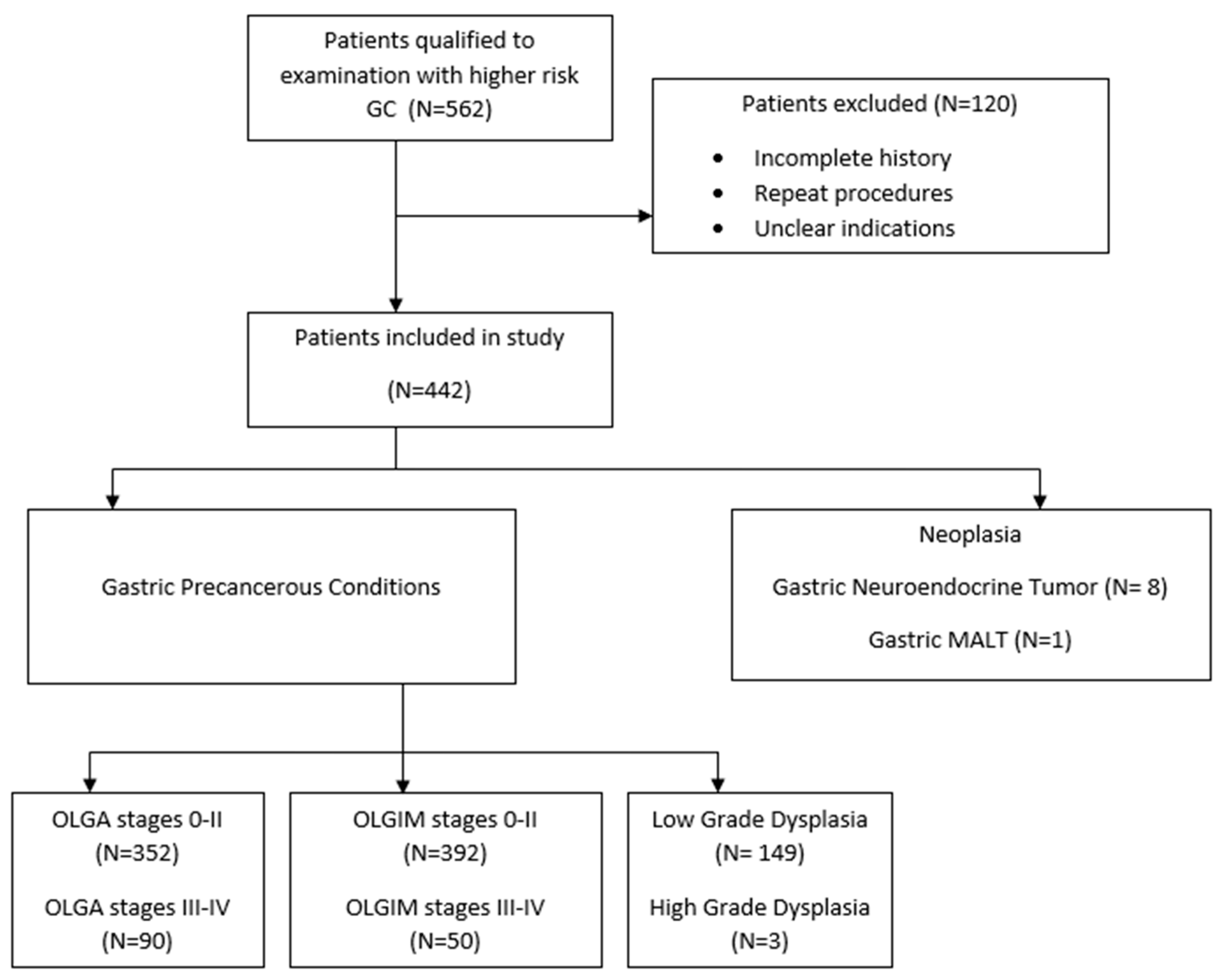 - Early detection of precancerous conditions (GPC) including atrophic gastritis (AG), intestinal metaplasia (IM), and dysplasia is crucial for gastric cancer (GC) management. This retrospective study analyzed 442 single gastroscopies to evaluate the relationship between endoscopy and histological findings including Operative Link for Gastritis Assessment (OLGA) and Operative Link for Gastric Intestinal Metaplasia Assessment (OLGIM) stagings in detecting advanced gastric precancerous conditions (GPCs) in patients with GC risk factors. Despite high specificity (~89%), endoscopic sensitivity was low (32.5% for OLGA III/IV, 40% for OLGIM III/IV), highlighting the need for systematic gastric mapping biopsies. Male sex and dysplasia were linked to a higher risk of extensive gastric IM. Interestingly, patients with a family history of gastric cancer more often had OLGA/OLGIM 0-II. These findings emphasize the importance of personalized risk assessment, integrating demographic and environmental factors in planning optimal time of screening gastroscopy and surveillance in high-risk GC populations.