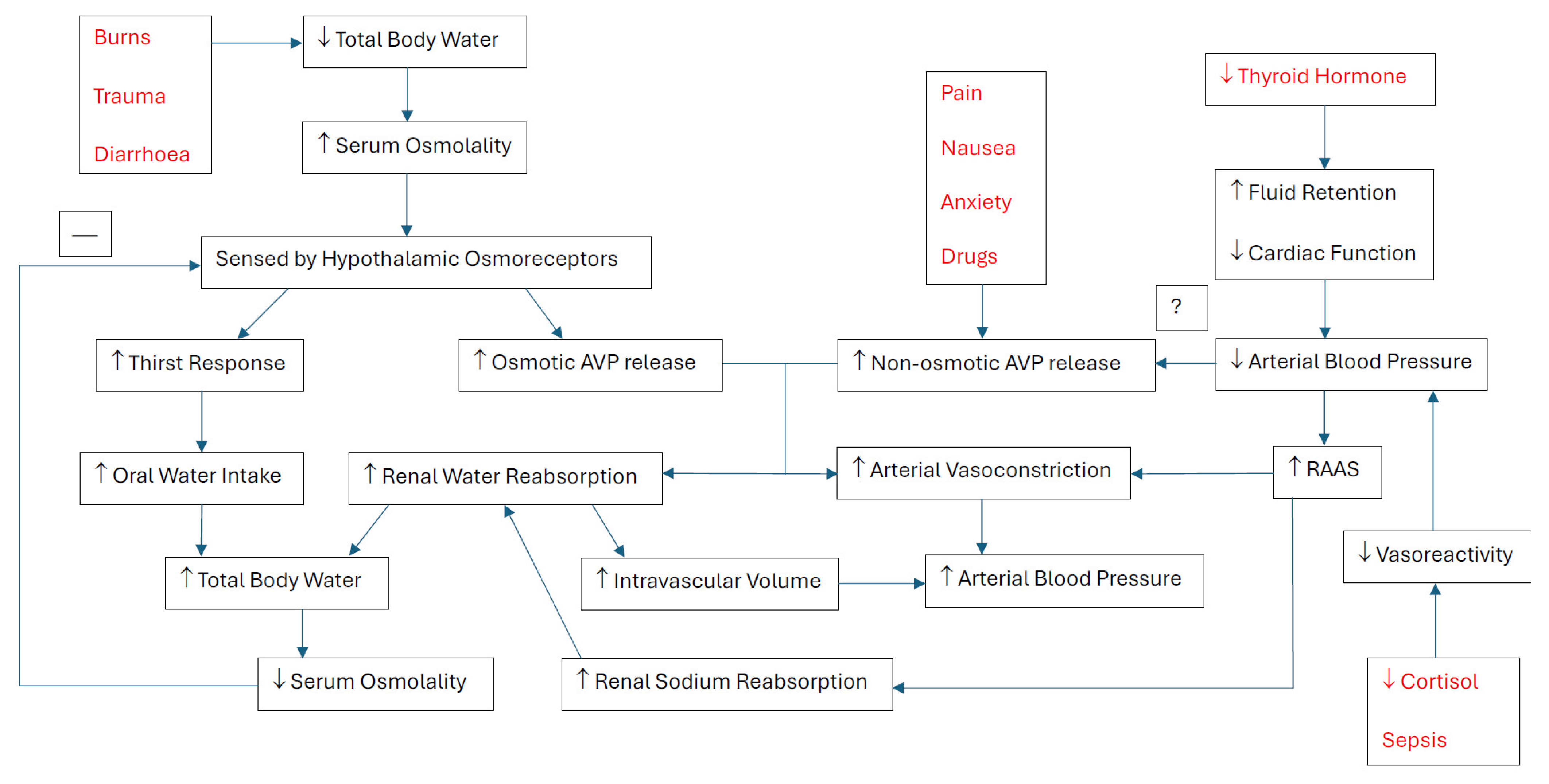 | Hypertonic (>285 mOsm/L) Hyperglycaemia Mannitol * Isotonic (275–285 mOsm/L) Hyperproteinaemia Hyperlipidaemia Hypotonic (<275 mOsm/L) SIADH CSW Addison’s Disease Diuretics Desmopressin Hypotonic Fluid Therapy Acute Kidney Injury Severe Hypothyroidism Severe Vomiting Severe Diarrhoea | High Urine Volume (>3 L/24 h) Diabetes Insipidus Hypertonic Saline Osmotic Diuresis (e.g., Mannitol) Low Urine Volume (<3 L/24 h) Low level of consciousness/no access to water Severe Burns |