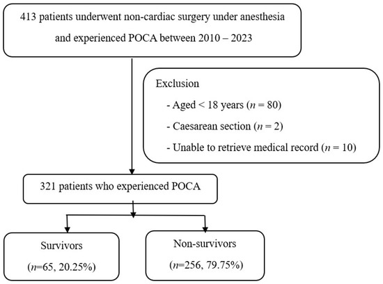 A total of 413 adult patients who experienced POCA following non-cardiac surgery under GA, RA, or MAC between January 2010 and December 2023 were initially identified. This study specifically focuses on adult POCA patients, making it directly relevant to your field of interest. After excluding patients under 18 years of age (n = 80), cesarean section cases (n = 2), and cases with inaccessible or missing clinical data (n = 10), a final cohort of 321 patients was included in the analysis. Among these, 65 patients (20.25%) the survivor group at 24 h following CPR, while 256 (79.75%) were in the non-survivor group. This is shown in Figure 1.