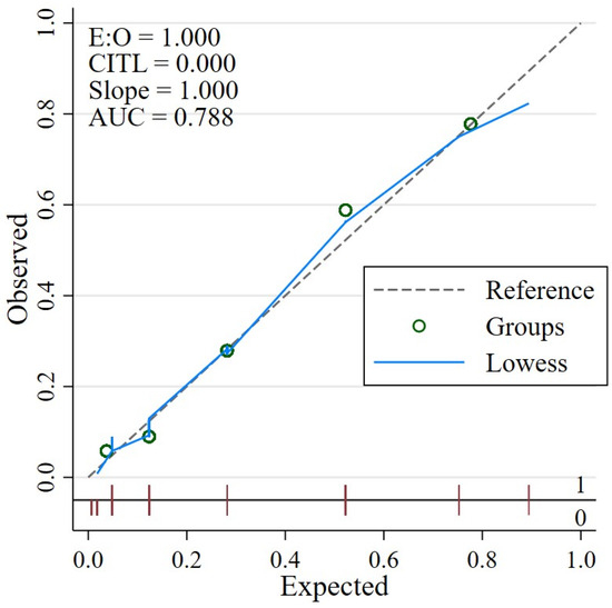 The model’s discriminative ability, as assessed by the AuROC, was found to be highly effective. With an AuROC of 0.788 (95% CI: 0.73–0.85) the model demonstrated a strong discriminatory performance (Figure 2). The model’s calibration was evaluated using the Hosmer–Lemeshow goodness-of-fit test (p = 0.535), and the calibration plot (Figure 3) further confirmed the model’s effectiveness by showing a close agreement between predicted and observed survival probabilities. Internal validation was performed using bootstrap resampling with 1000 replications. The apparent area under the AuROC was 0.826. The optimism estimated through bootstrapping was 0.009, resulting in an optimism-adjusted AuROC of 0.817. This minimal decrease reassures the readers of the model’s good internal validity and low risk of overfitting.