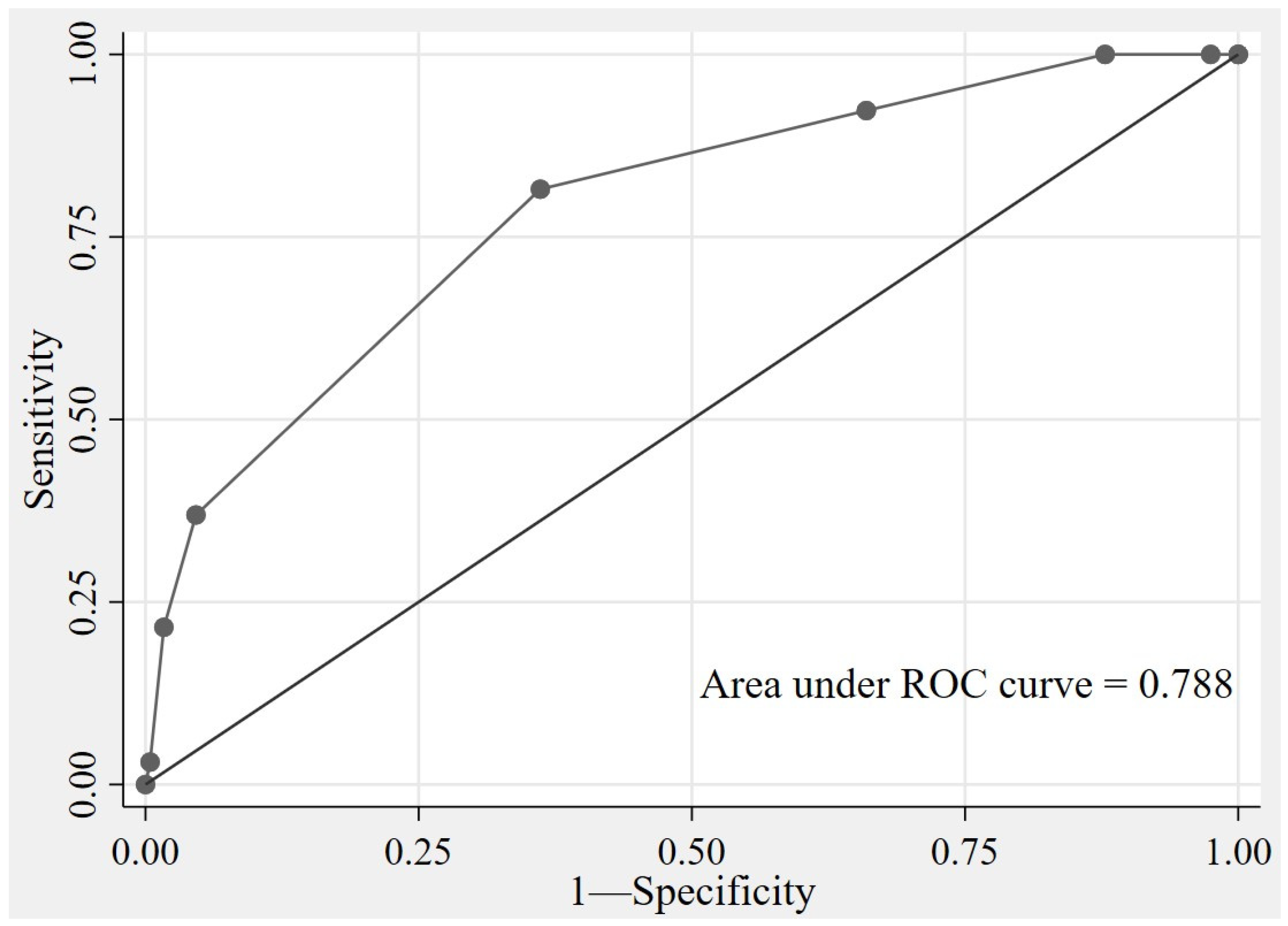 Figure 2. Receiver Operating Characteristic Curve for the Final Model. (AuROC = 0.788, 95% CI: 0.73–0.85).
