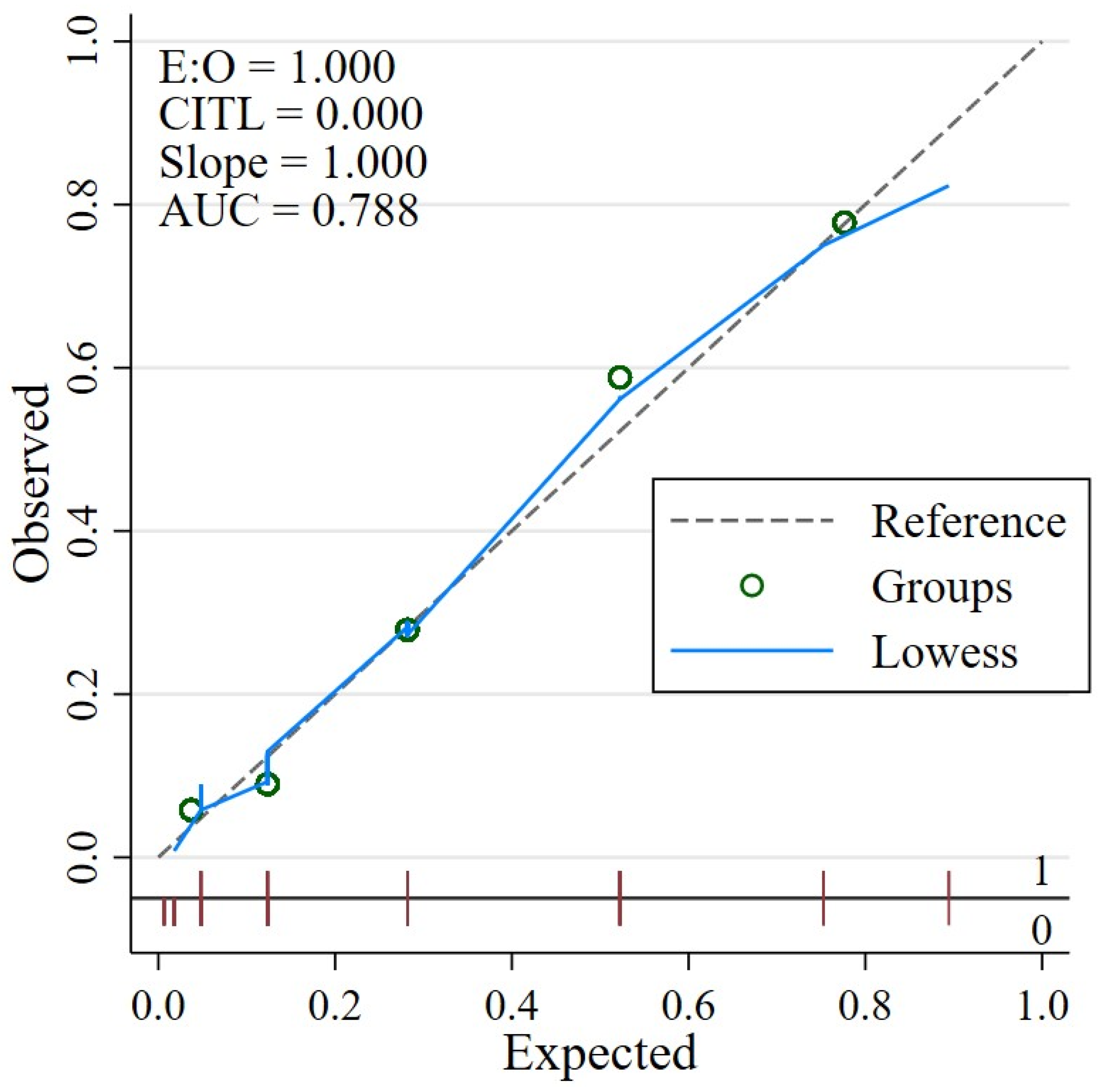 Figure 3. Calibration Plot Comparing Predicted and Observed Survival Probabilities. LOWESS-smoothed curve approximates the diagonal reference line. Hosmer–Lemeshow test: p = 0.535.