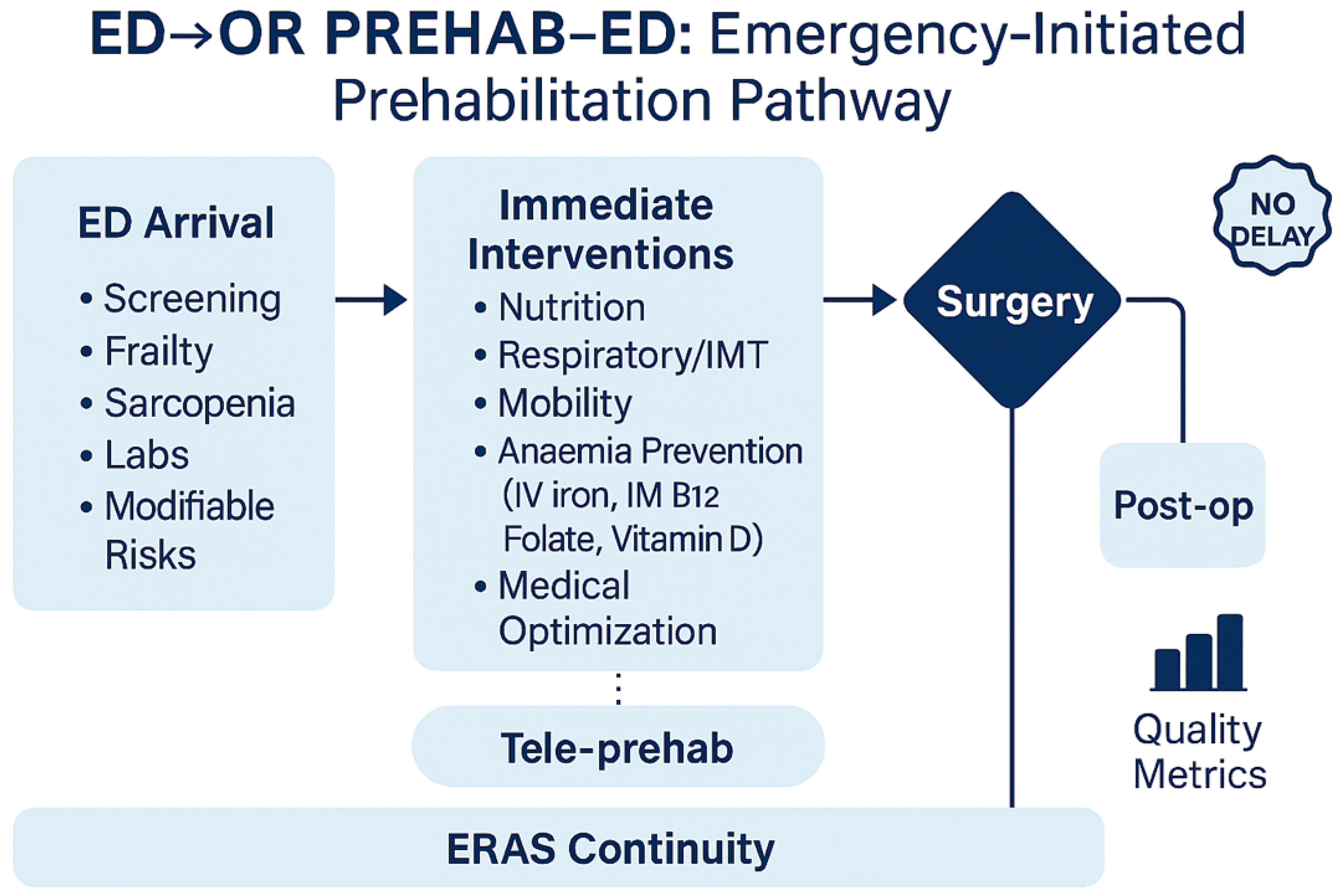 - Activate a minimal, ED-initiated, ERAS-aligned bundle comprising multi-modal analgesia, goal-directed fluids, early safe nutrition, respiratory preparation, mobilization intent, and pragmatic PBM (CBC, ferritin/TSAT; consider IV iron when indicated/logistically neutral; correct B12/folate/vitamin D as appropriate) under an explicit no-delay rule [5,6,9,16].