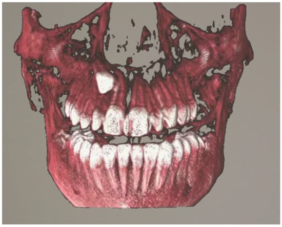 Patients with impacted teeth undergoing CBCT were identified from the University Dental Clinic in Kraków data. All qualified tomography scans were approved by an orthodontic specialist so that they presented an image corresponding to the most common images of impacted teeth. The selected data was exported in the Digital Imaging and Communications in Medicine (DICOM) file format. 10 radiographs of selected studies included cases of impacted maxillary canine, an impacted mandibular canine, an impacted mandibular molar, an impacted incisor, and multiple impacted teeth. The average age of the patient whose tomography was visualized using the headset was 12.4 years. The CBCT scans were acquired using a KaVo OP 3D PRO unit (Kavo Dental, Biberach, Germany) with the following parameters: 90 kV, 5 mAs, 8 ms. The field of view (FOV) was identical for all radiographic examinations analyzed, with a parameter of 78 × 150 mm. CBCT radiographs were anonymized, and then subjected to semi-automatic segmentation. The segmented CBCT was uploaded to an application that allows visualization of three-dimensional images using HoloLens 2 goggles (Microsoft, Redmond, WA, USA) [10]. Figure 1 and Figure 2 present the visualization of impacted canine in mixed reality.