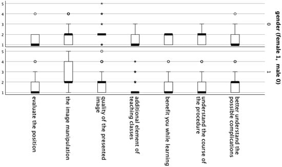 A statistically significant relationship was found between the responses of females and males regarding the quality of the presented image using HoloLens 2 goggles (Table 2, Figure 3).