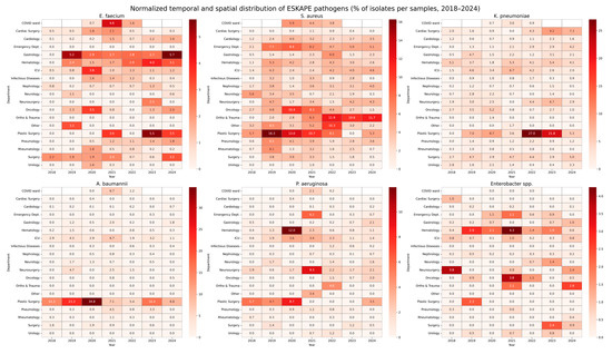Normalized temporal and spatial distribution of ESKAPE pathogens (% of isolates per samples, 2018–2024). This figure presents heatmaps illustrating the relative prevalence of ESKAPE pathogens (Enterococcus faecium, Staphylococcus aureus, Klebsiella pneumoniae, Acinetobacter baumannii, Pseudomonas aeruginosa, and Enterobacter spp.) across hospital departments between 2018 and 2024. For each pathogen, the heatmap displays the proportion of isolates detected in a given department and year, normalized to the total number of microbiological samples collected in that department during the corresponding year. Values are expressed as percentages. Darker shades indicate a higher relative proportion of pathogen-positive samples, while lighter shades indicate lower prevalence. This visualization enables simultaneous interpretation of both the temporal dynamics and the spatial distribution of pathogens, adjusted for variations in the sampling intensity across departments.