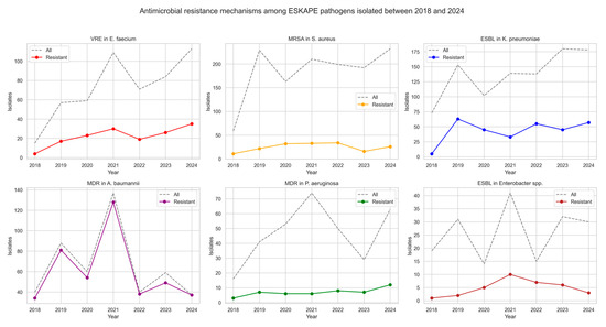 Between 2018 and 2024, ESKAPE pathogens exhibiting antimicrobial resistance were isolated, showing variable frequencies across years and species (see Table 2 and Figure 2). The proportion of vancomycin-resistant Enterococcus faecium (VRE) ranged between 26.7% and 39.0%, with no consistent upward or downward trend.