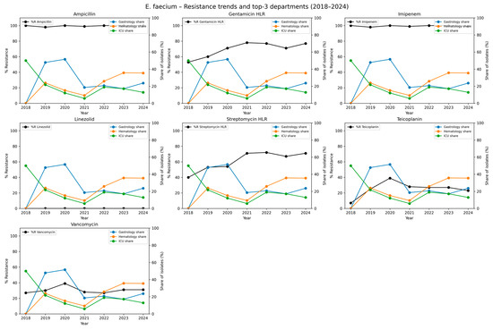 Temporal trends in antimicrobial resistance of Enterococcus faecium isolates and distribution across hospital departments, 2018–2024. Each subplot represents one antimicrobial agent tested against E. faecium. The black line shows the annual percentage of resistant isolates (%R) across all departments combined. The colored lines represent the relative contribution (share of isolates, expressed as a percentage of all E. faecium isolates in a given year) of the three hospital departments with the highest cumulative number of isolates across the study period. The left y-axis corresponds to the share of isolates per department (colored lines). This dual-axis approach allows simultaneous visualization of temporal resistance trends and the spatial distribution of isolates in the clinical setting. Higher %R values indicate reduced effectiveness of a given antimicrobial, while higher departmental shares indicate wards where E. faecium was most frequently detected.