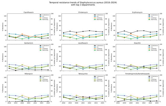 Temporal resistance trends of Staphylococcus aureus (2018–2024) with spatial context of isolates from the top three hospital departments. Each subplot illustrates the temporal trend in the percentage of S. aureus isolates resistant to a given antibiotic (black line) between 2018 and 2024. In parallel, the colored lines depict the relative contribution (%) of isolates originating from the tree hospital departments with the highest cumulative number of detections (Intensive Care Unit, Cardiology ward, Hematology ward). The left axis (black line) corresponds to the % resistance to the antibiotic, while the right axis (colored lines) shows the % share of isolates from individual departments relative to the total isolates defined in a given year.