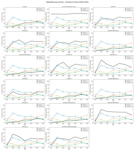 Among K. pneumoniae isolates, high and stable resistance rates were observed for amoxicillin/clavulanate, with annual resistance ranging from 71.6% to 75.6% and an overall rate of 73.6%. Similarly, high resistance was noted for ciprofloxacin (range: 42.1–83.7%, total: 54.6%), piperacillin/tazobactam (45.5–76.5%, total: 54.2%), cefuroxime (40.3–71.6%, total: 51.2%), and trimethoprim/sulfamethoxazole (41.7–56.5%, total: 46.3%). Resistance to third- and fourth-generation cephalosporins, including cefepime, cefotaxime, and ceftazidime, increased over time and exceeded 50% in recent years (total range: 45.4–47.7%). Moderate resistance was found for gentamicin (21.0–40.6%, total: 30.8%) and tobramycin (34.5–72.5%, total: 47.5%). Resistance to amikacin remained lower, with a total rate of 18.8%, though it increased from 12.7% in 2020 to 31.6% in 2023. Resistance to carbapenems also increased over the study period, reaching a rate of over 21% in 2024 (total 14.4%). Initially, resistance to newer β-lactam/β-lactamase inhibitor combinations–such as ceftazidime/avibactam, ceftolozan/tazobactam, imipenem/relebactam, and meropenem/vaborbactam, was low; however, a gradual increase was observed from 2023 to 2024, reaching a total of 12.0%. The detailed data are presented in Table 5 and Figure 5.