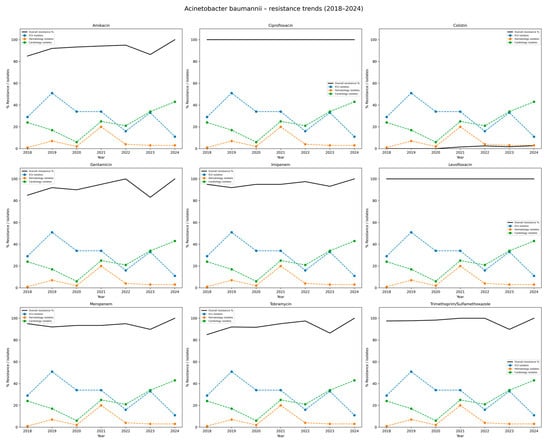 Distribution of antibiotic resistance rates of Acinetobacter baumannii isolates, 2018–2024. Each subplot displays the percentage resistance of A. baumannii to a single antibiotic. The black line depicts overall resistance rates in the hospital. The colored dashed lines correspond to the departments with the highest number of isolates (here: Intensive Care Unit, Hematology ward, Cardiology ward). The Y-axis combines % resistance and isolate counts for top departments, while the X-axis shows study years (2018–2024). The figure highlights persistently high resistance rates, particularly to carbapenems and fluoroquinolones, underlying the clinical challenge posed by multidrug-resistant A. baumannii.
