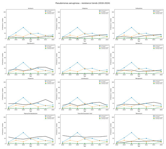 Resistance trends of Pseudomonas aeruginosa isolates, 2018–2024. Each subplot illustrates the resistance rate of P. aeruginosa to a given antibiotic. The black line indicates the overall hospital resistance percentage. The colored dashed lines represent the number of isolates reported in the three hospital departments with the highest incidence (here: Intensive Care Unit, Hematology ward, Cardiology ward). The Y-axis: percentage resistance and departmental isolate counts; the X-axis: study years (2018–2024). The figure shows considerable variability across antibiotics, with worrying levels of resistance to carbapenems and fluoroquinolones, highlighting P. aeruginosa as the major multidrug-resistant pathogen.