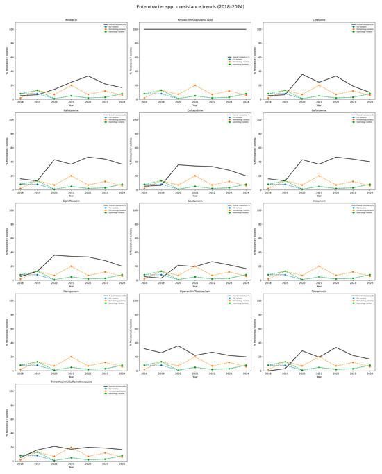 Resistance trends of Enterobacter spp. isolates, 2018–2024. Each subplot shows the resistance rate of Enterobacter spp. against a specific antibiotic. The black line depicts the overall hospital resistance percentage. The colored dashed lines represent isolate counts in the three hospital departments with the highest incidence (here: Intensive Care Unit, Hematology ward, Gastrology ward). The Y-axis: percentage resistance and isolate counts; the X-axis: study years (2018–2024). This visualization highlights the increasing resistance of Enterobacter spp. to multiple β-lactams and fluoroquinolones, while carbapenem resistance remained absent during the study period.