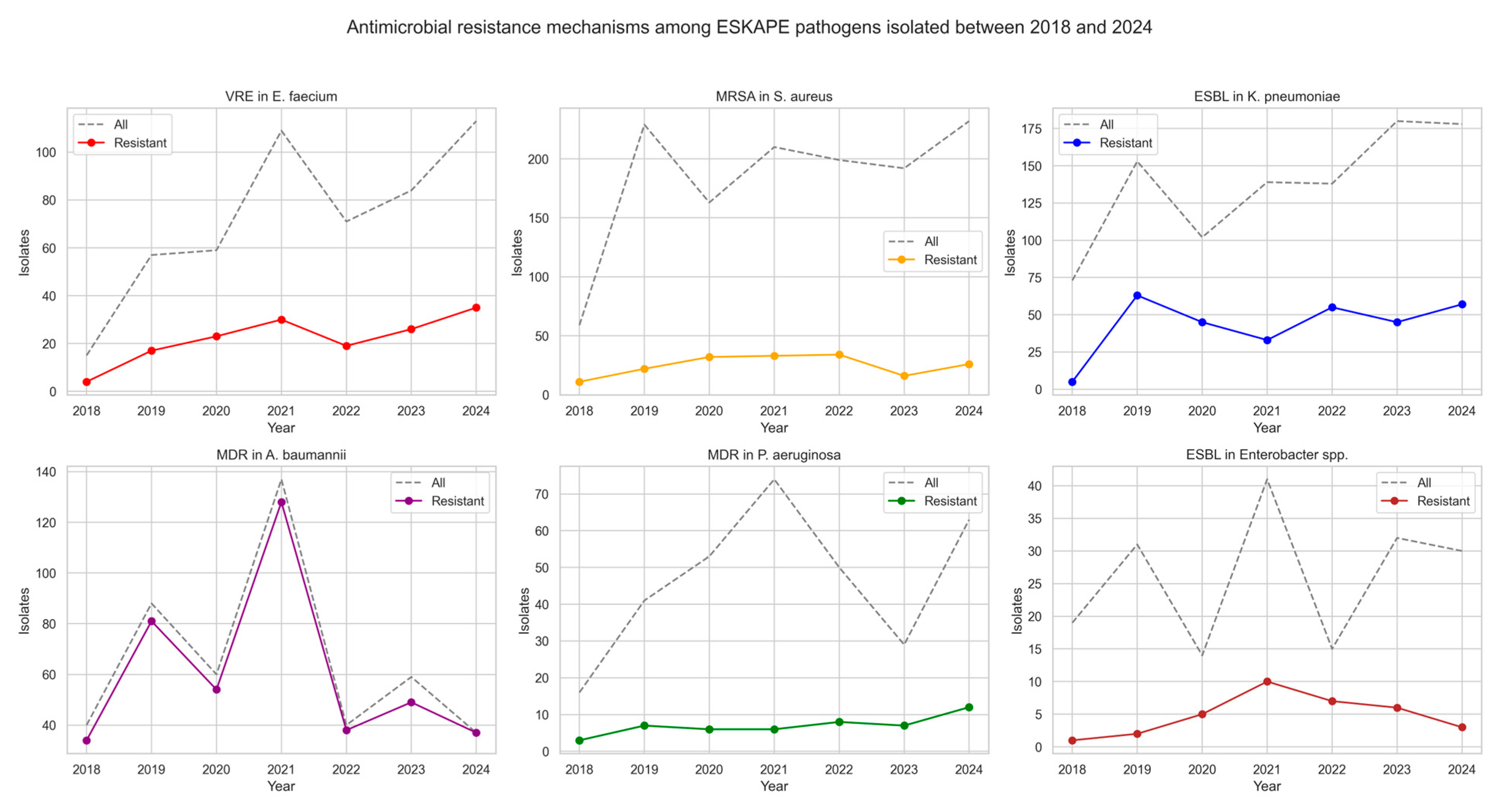 Guzek, A.; Tomaszewski, D.; Rybicki, Z.; Piechota, W.; Mackiewicz, K.; Konior, M.; Olczak-Pieńkowska, A. ESKAPE Pathogens in Bloodstream Infections: Dynamics of Antimicrobial Resistance from 2018 to 2024—A Single-Center Observational Study in Poland. J. Clin. Med. 2025, 14, 6932. https://doi.org/10.3390/jcm14196932