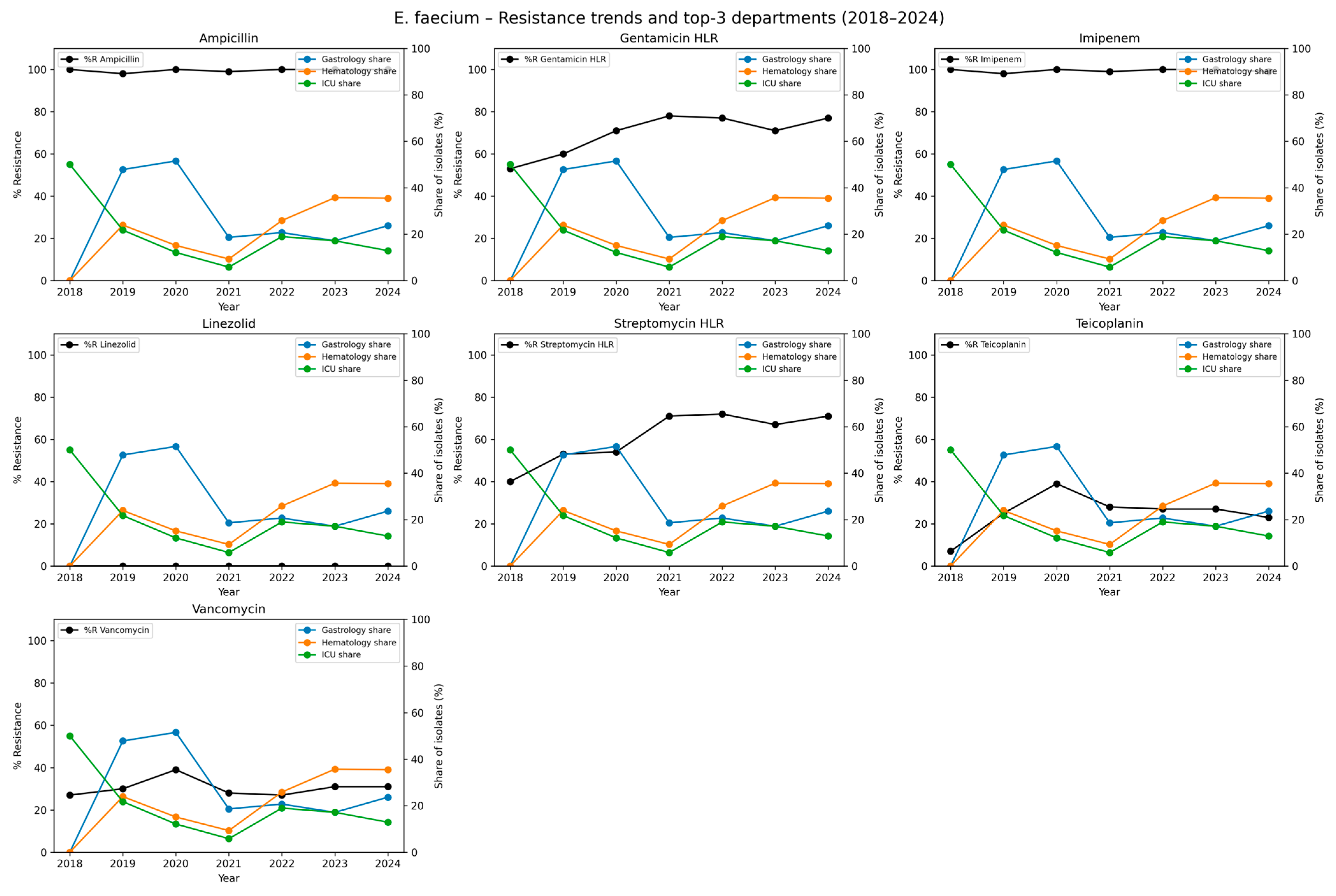 VRE | 4 (26.7%) | 17 (29.8%) | 23 (39.0%) | 30 (27.5%) | 19 (26.8%) | 26 (31.0%) | 35 (31.0%) | |