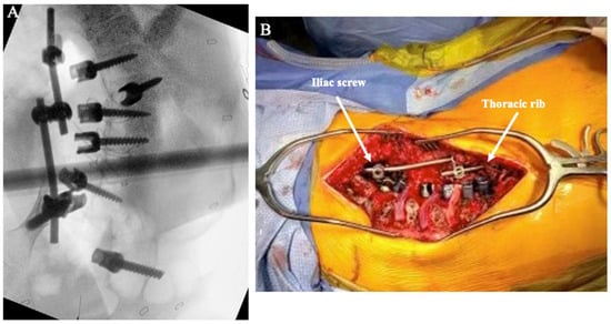 Intraoperative X-ray showing a construct-to-construct internal distraction technique with an iliac screw serving as the distal anchor point and the last thoracic rib serving as the proximal anchor point (A). Intraoperative photo showing the iliac screw to thoracic rib setup before distraction is performed (B).