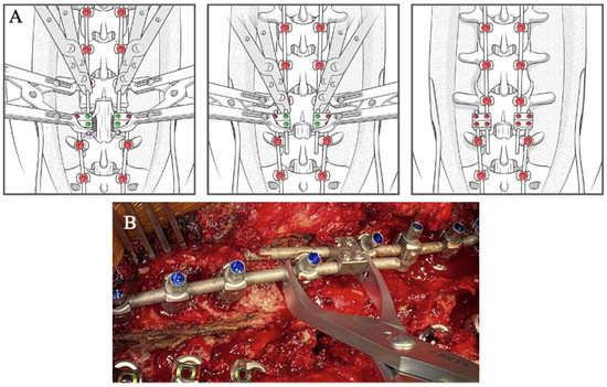 Step-by-step schematic of the construct-to-construct internal compression technique for closure of PSO. The green caps represent loose set caps. Red caps represent tight set caps (A). Intraoperative image adapted from Bourghli et al. showing a construct-to-construct internal compression technique to close a PSO site (B).