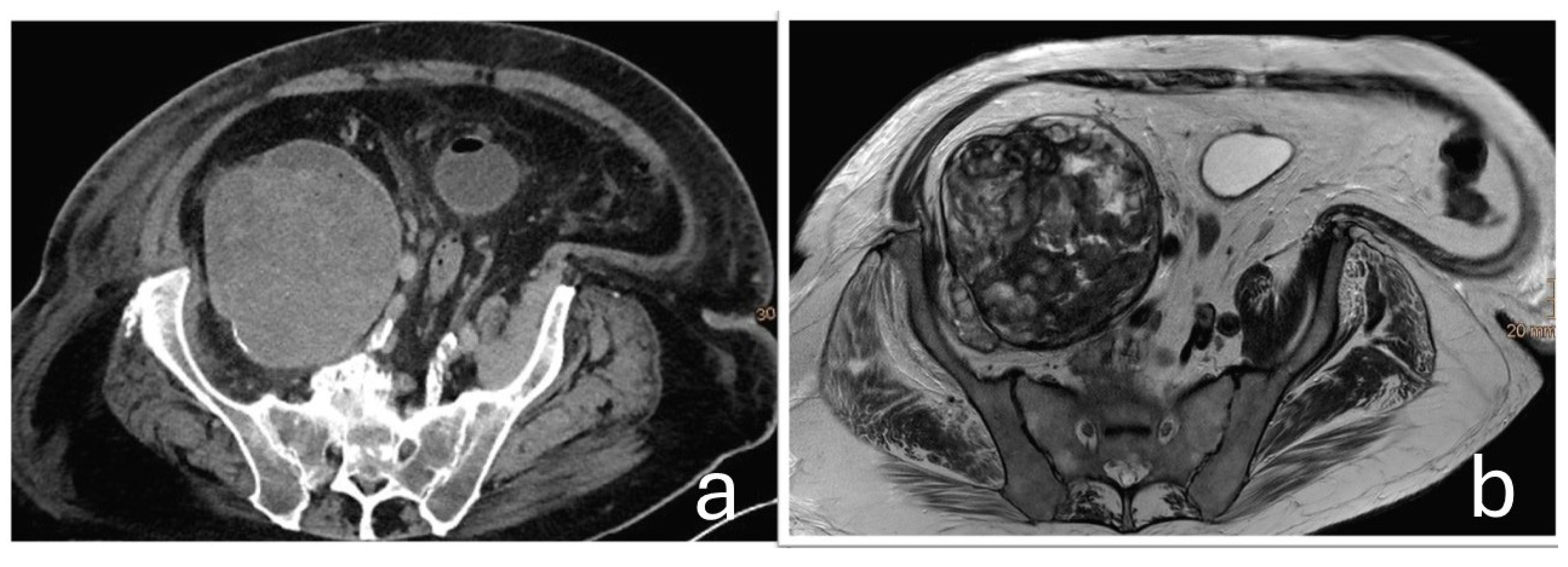A 75-year-old male patient was transferred to the oncology department of our hospital following the discovery of a large retroperitoneal mass on Computed Tomography (CT) and Magnetic Resonance Imaging (MRI). The lesion, measuring 15 × 13 × 11.5 cm with both cystic and solid components, was adherent to the iliac vessels and suspected to be malignant (