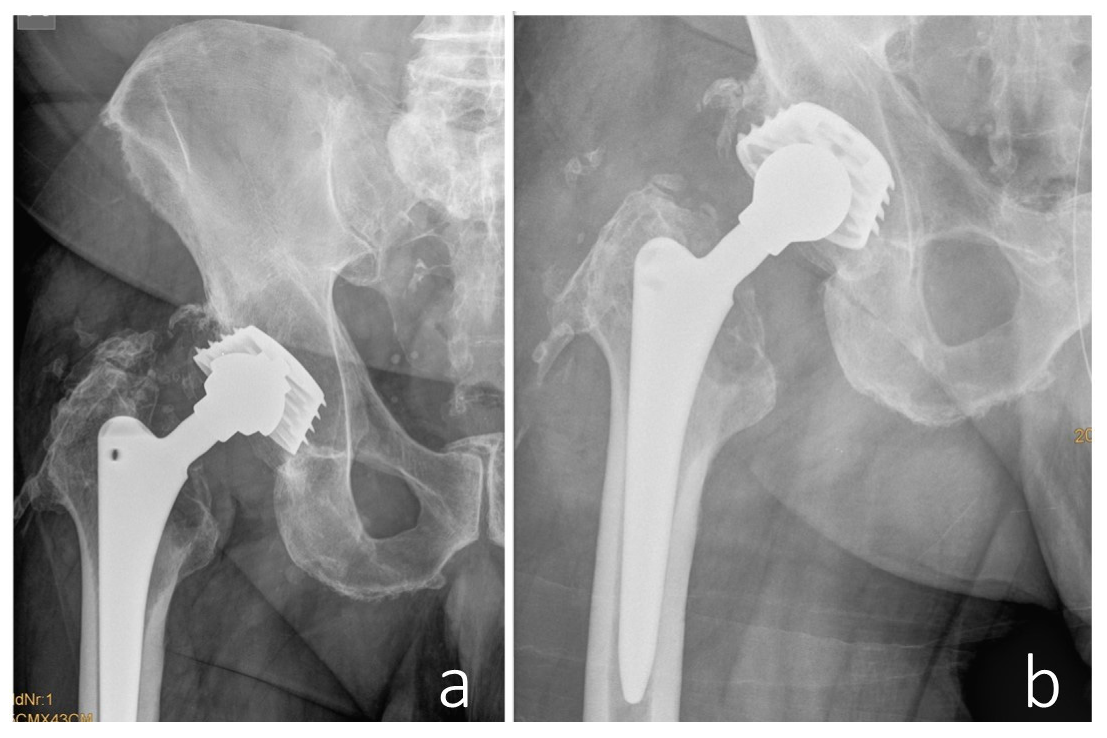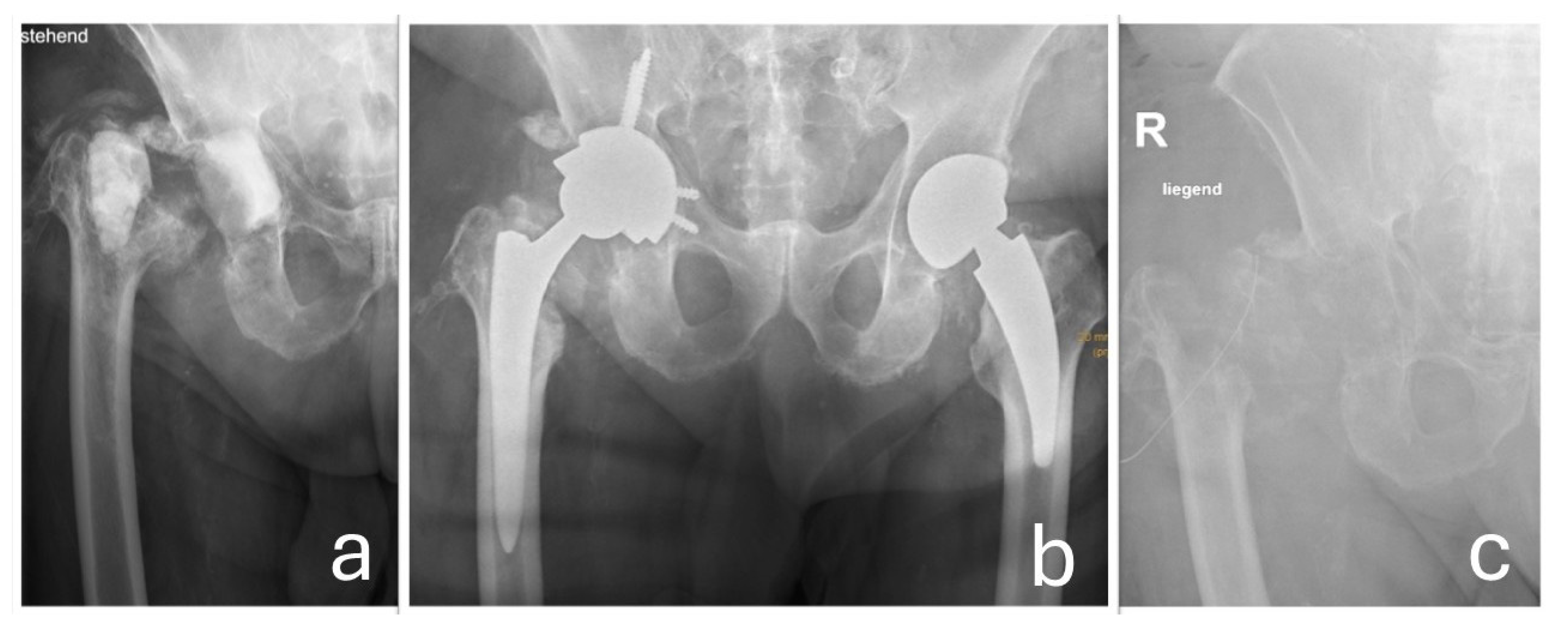 At the time of the orthopedic consultation at the University Clinic of Orthopaedics and Traumatology, Paracelsus Medical University of Salzburg, Austria, the patient’s cardiorespiratory condition had already significantly improved, and the inflammatory markers were regressing (C-reactive protein: 4 mg/dL; leukocytes: 7.4 G/L). Although the consultation was initially scheduled to obtain a biopsy of the tumor, attention was redirected to the patient’s long-standing hip arthroplasty.