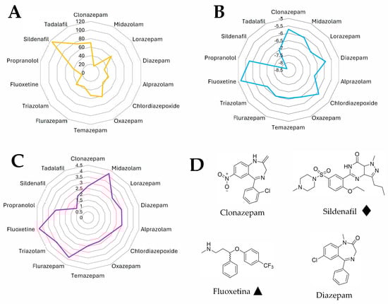 Radar plots were generated to visually compare physicochemical descriptors across the full panel of compounds. Chemical structures of selected representative drugs—clonazepam, fluoxetine, sildenafil, and diazepam—were drawn and energy-minimized using ChemDraw 3D (PerkinElmer, version 12.0, Waltham, MA, USA) to illustrate their structural diversity and relevance to their physicochemical behavior [21,22,23].