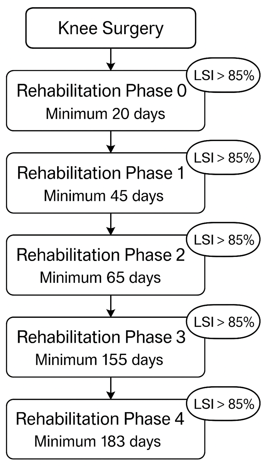 After completing an exercise phase for a defined period, a new evaluation test was carried out followed by a new assignment to the rehabilitation phases. Progress can only be made if the LSI is greater than 85% and a minimum number of days have been completed. Phase 0 had to be completed after at least the 20 postoperative day, phase 1 by day 45, phase 2 by day 65, phase 3 by day 155, and phase 4 by day 183 (