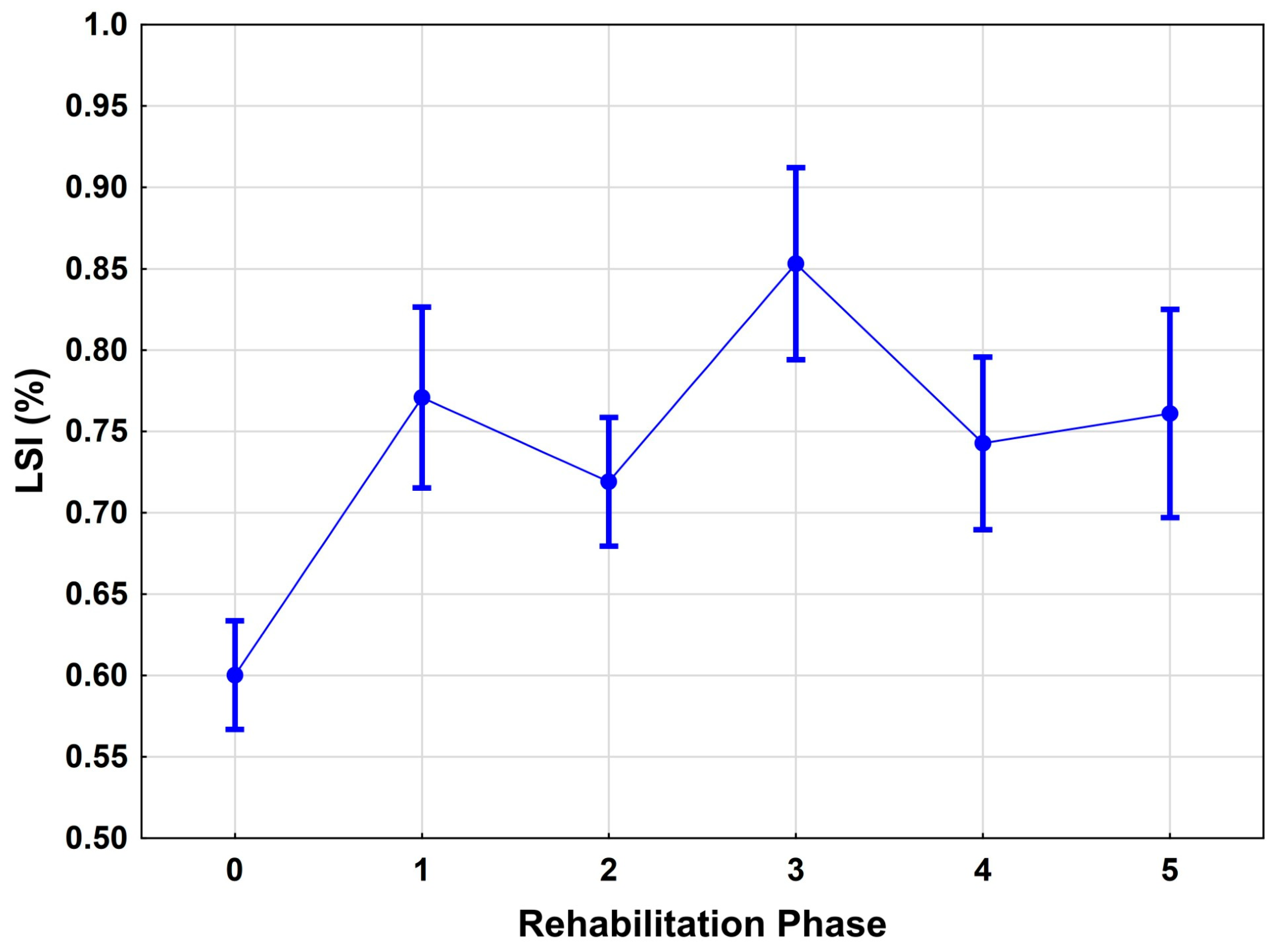 The present analysis demonstrates a clear, statistically significant improvement in functional capacity as measured by the Limb Symmetry Index (LSI) over the course of rehabilitation. Specifically, the LSI increased from a mean of 0.64 in phase 0 to 0.81 in phase 2, reflecting an early and marked gain in lower extremity function (