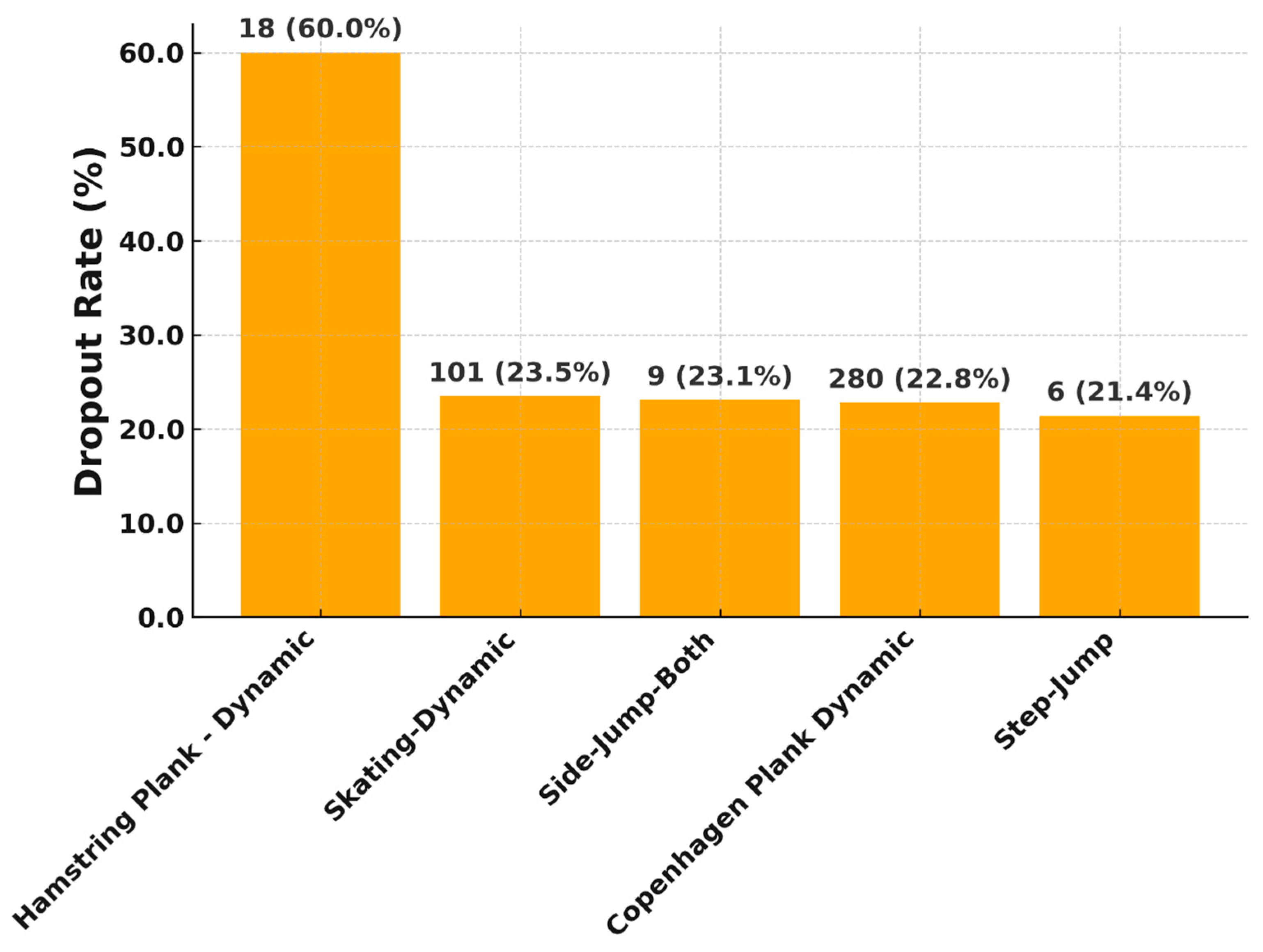 28]. Similarly, Rocker Side Band-Frequent is characterized by repetitive lateral movement with band resistance, stressing the lateral kinetic chain, which can provoke discomfort due to the constant tension and low-level isometric hold requirements. Exercises like Package-which may involve a compound or novel movement pattern-are often rated painful because they lack individualized progression schemes and may not be well aligned with patients’ current functional levels. Evidence suggests that poorly timed progression or lack of personalization in rehabilitation programming increases the likelihood of overexertion and pain flare-ups [